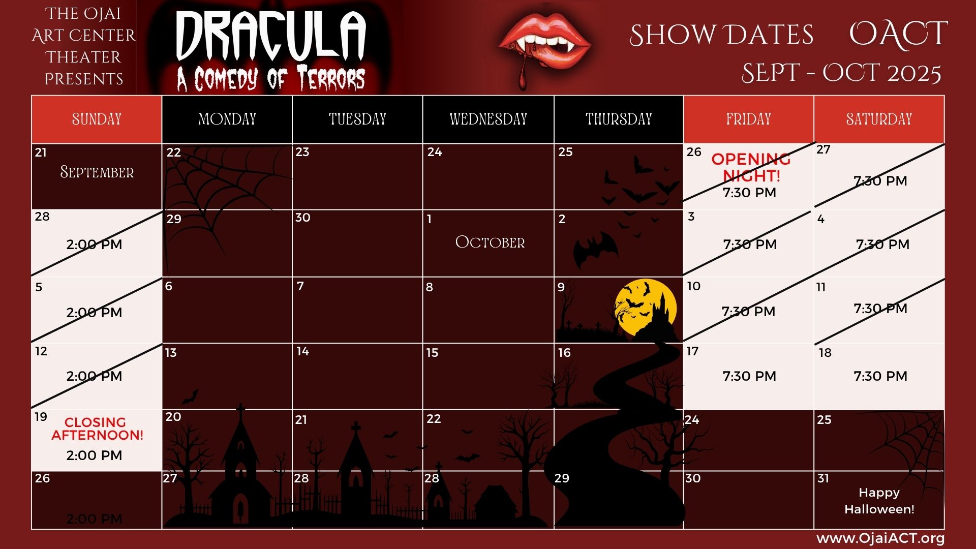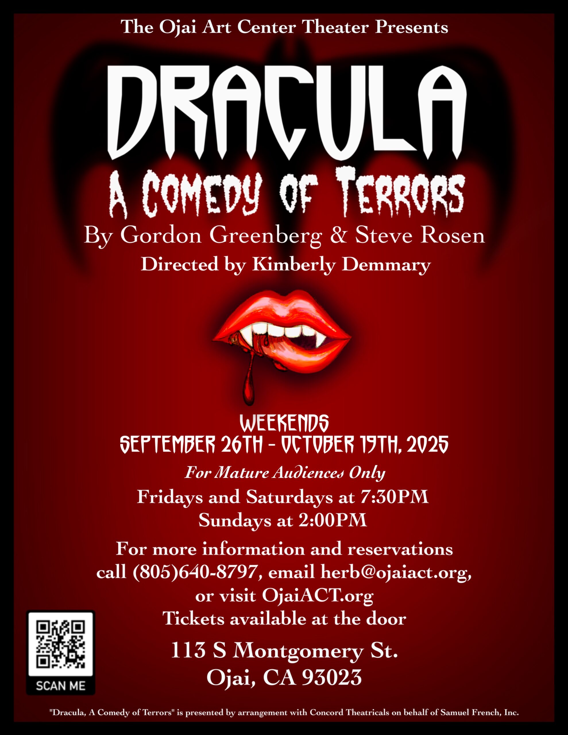 Tickets are available now! They can be purchased online, at the door on the performance night, over the phone at 805-640-8797, or by emailing Herb@ojaiact.org to make your reservations! Doors open at 6:45 PM on Fridays and Saturdays, and 1:15 PM on Sundays.