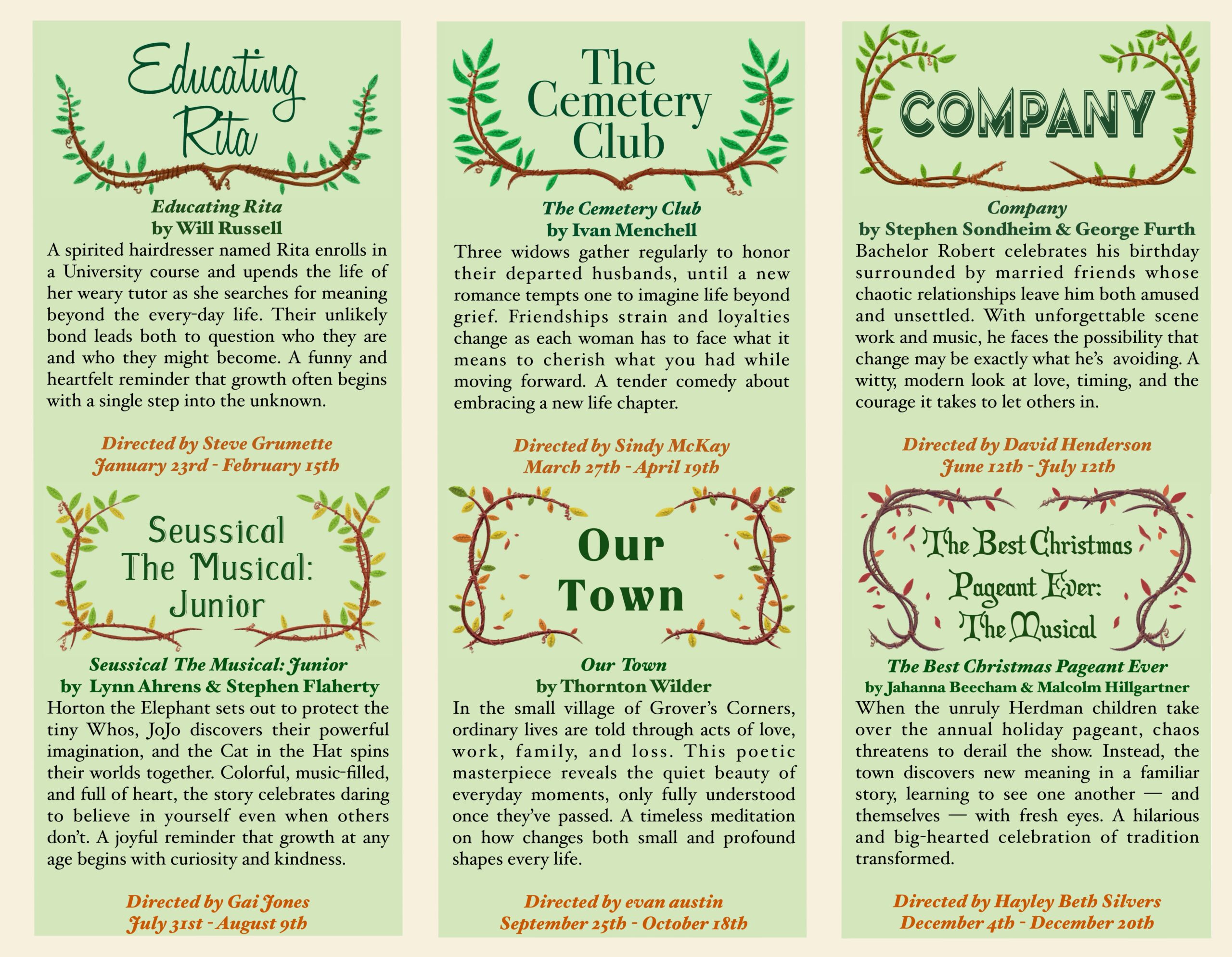 We have finalized our 2026 Theatrical Season! We have a lineup of shows whose stories are rooted in the growth, challenges, and journeys life will take us on.