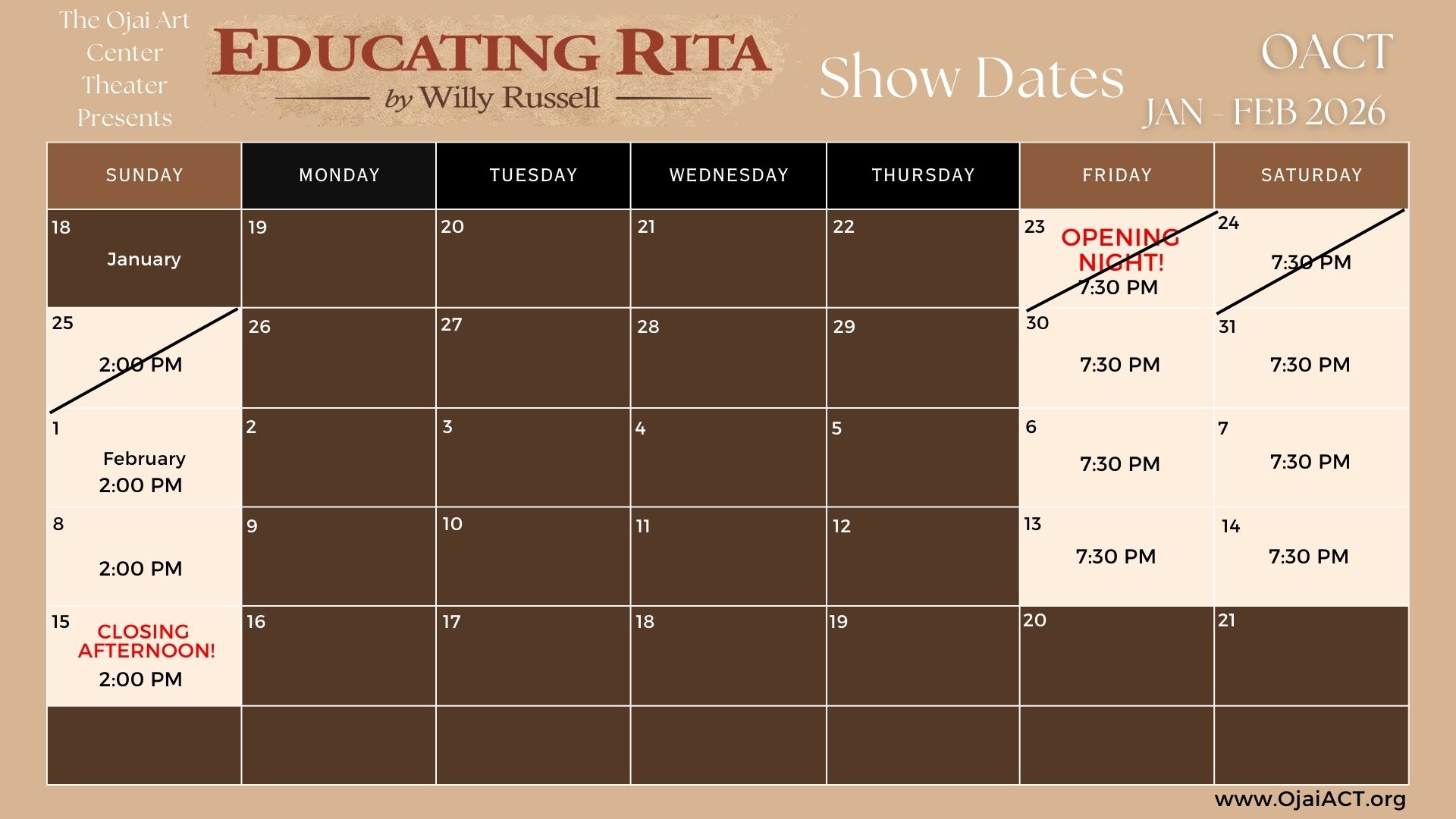 Tickets are available now! They can be purchased online, at the door, over the phone at 805-640-8797, or by emailing Herb@ojaiact.org to make reservations. Doors open at 6:45 PM on Friday and Saturday evenings, and 1:15 PM on Sunday matinees.